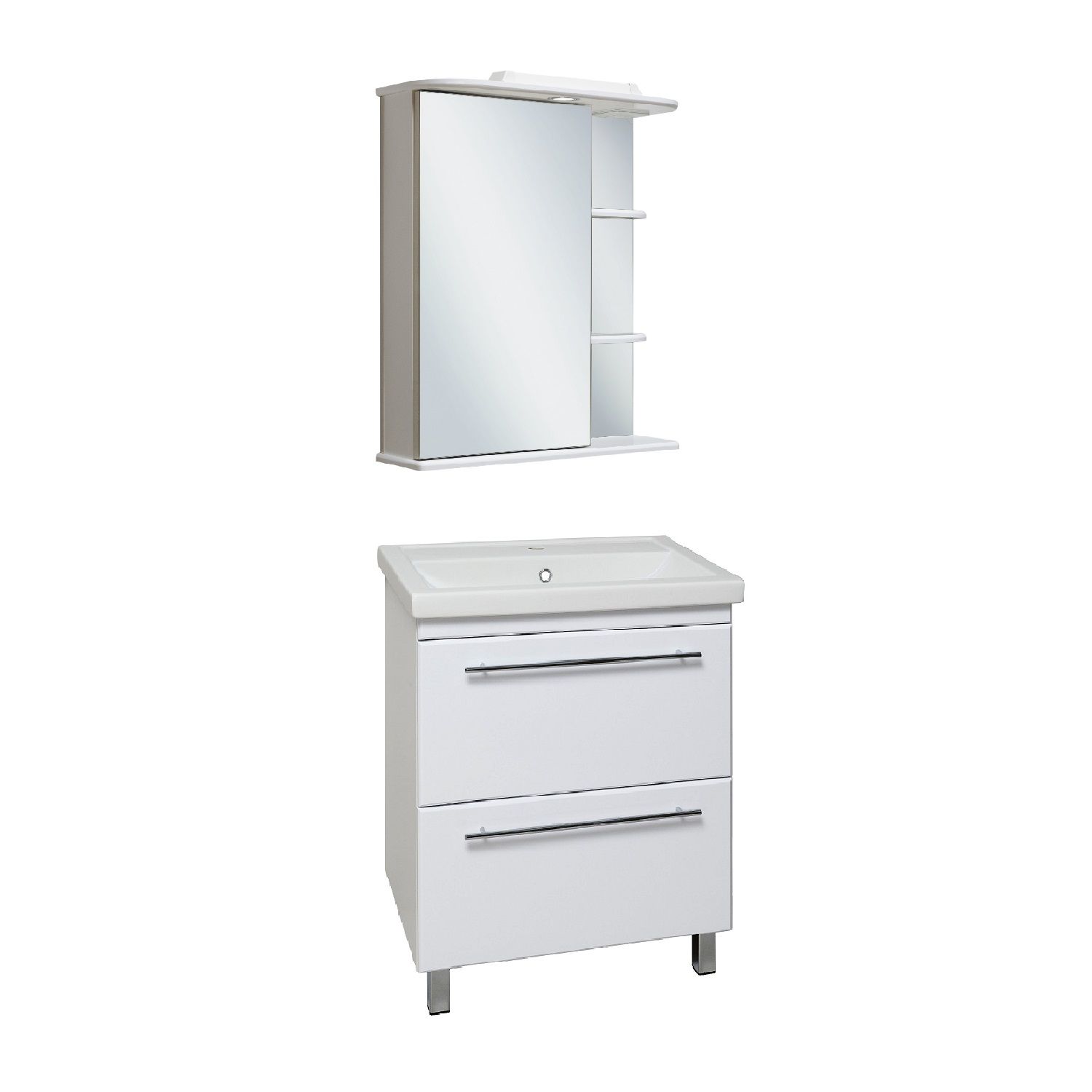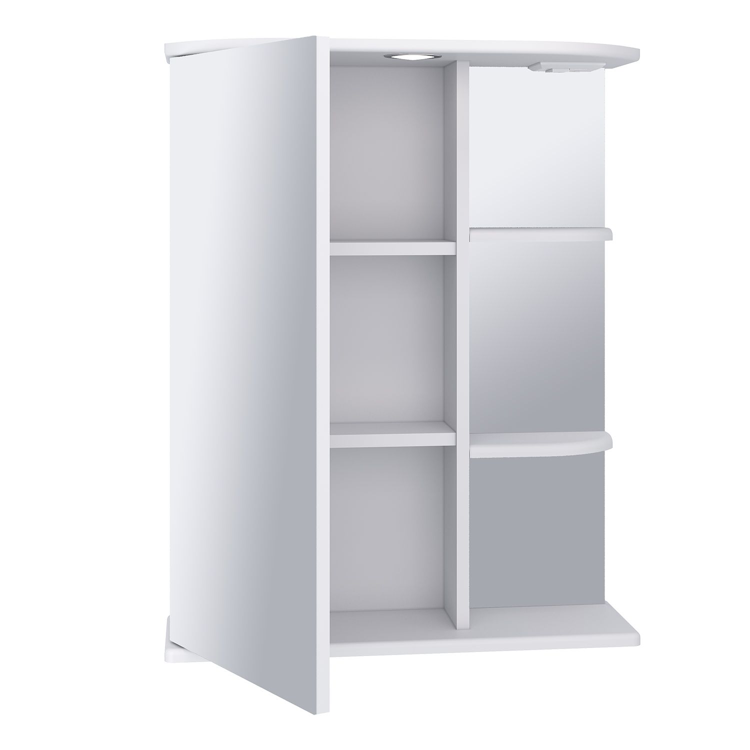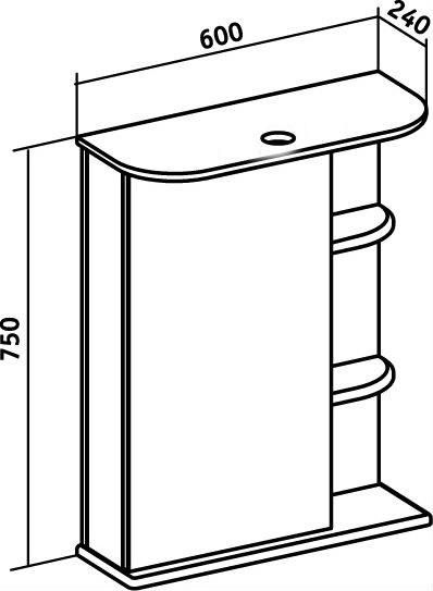 Зеркальный шкаф оборудован одним врезным светодиодным светильником 220В и розеткой с выключателем. Слева - шкаф с зеркальной дверцей и двумя внутренними полками, справа - две открытые полочки. Петли со встроенным доводчиком. Выпускается только в левом исполнении.