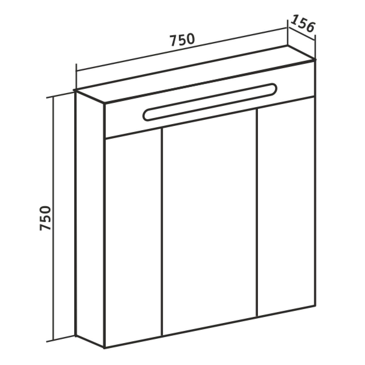 Зеркальный шкаф со встроенной сверху люминесцентной подсветкой и тремя отделениями с зеркальными фасадами. Внутри - две встроенные полки. Блок розетка/выключатель расположен внутри шкафа. Петли со встроенным доводчиком.