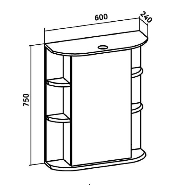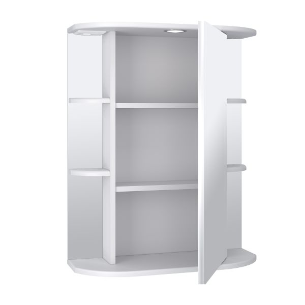 Зеркальный шкаф оборудован одним врезным светодиодным светильником 220В и розеткой с выключателем. По центру - шкаф с зеркальной дверцей и двумя внутренними полками, справа и слева -по две открытые полочки. Петли с доводчиком. Выпускается только в правом исполнении.