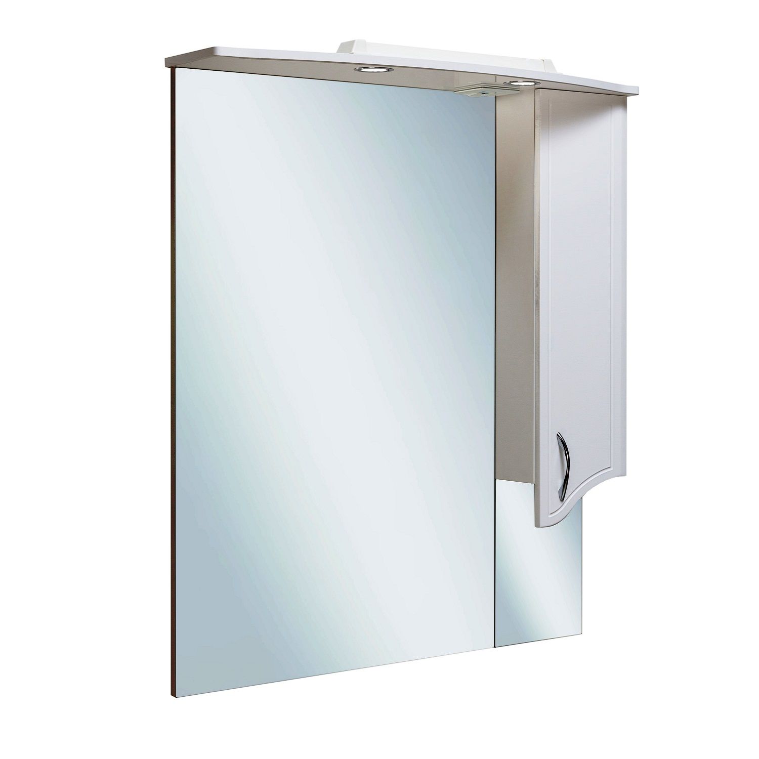 Зеркальный шкаф оборудован одним врезным светодиодным светильником 220В и розеткой с выключателем. Справа - шкафчик с распашным фасадом и двумя внутренними полками. Петли со встроенным доводчиком, ручка - 1шт. Выпускается только в правом исполнении.