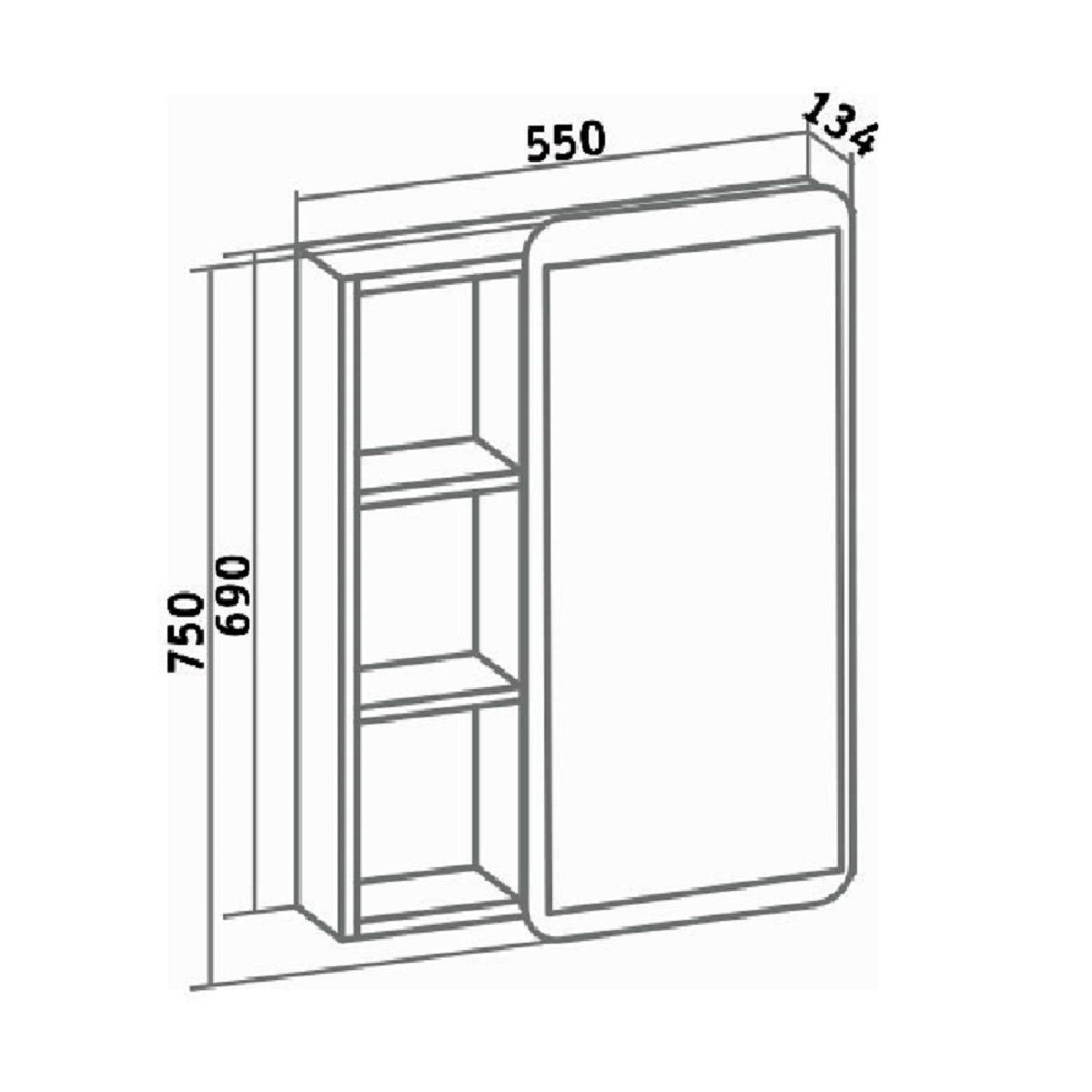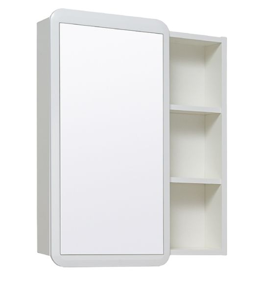 Зеркальный шкаф без подсветки с одной распашной дверкой и открытыми полками (слева или справа, зависит от установки). Внутри шкафа две внутренние полки. Петли со встроенным доводчиком. Универсальный.
