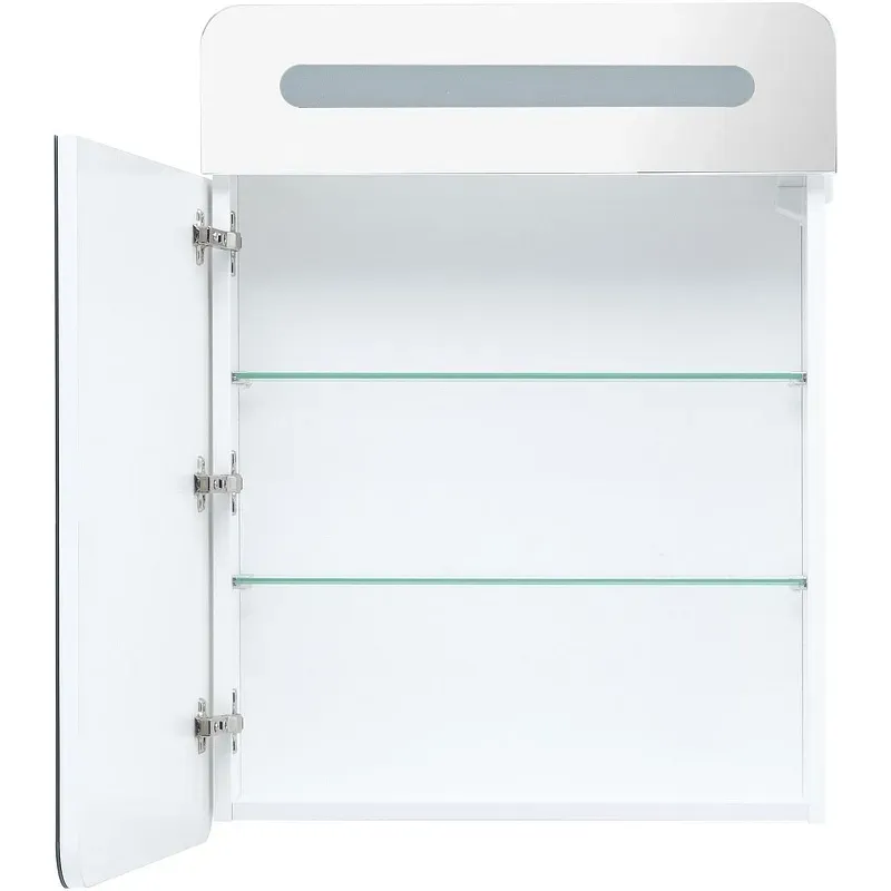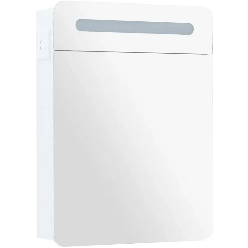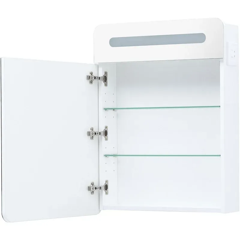 Зеркальный шкаф комплектуется выключателем и розеткой которые расположены на корпусе.
