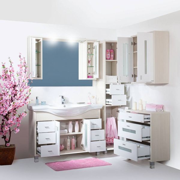 Внутреннее содержание шкафа умело организовано: разнообразные полки и отсеки позволяют удобно разместить все необходимые аксессуары – от косметики до бытовой химии. Зеркало, интегрированное в фасад, визуально расширяет пространство и облегчает утренние рутинные процедуры.