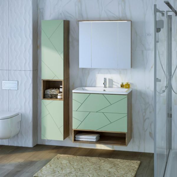 Внутреннее содержание шкафа умело организовано: разнообразные полки и отсеки позволяют удобно разместить все необходимые аксессуары – от косметики до бытовой химии. Зеркало, интегрированное в фасад, визуально расширяет пространство и облегчает утренние рутинные процедуры.