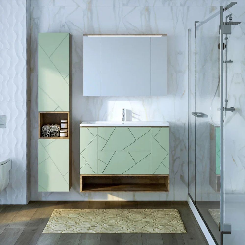 Внутреннее содержание шкафа умело организовано: разнообразные полки и отсеки позволяют удобно разместить все необходимые аксессуары – от косметики до бытовой химии. Зеркало, интегрированное в фасад, визуально расширяет пространство и облегчает утренние рутинные процедуры.