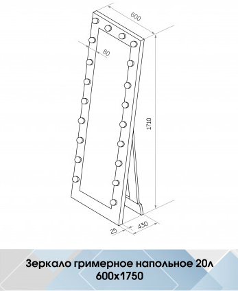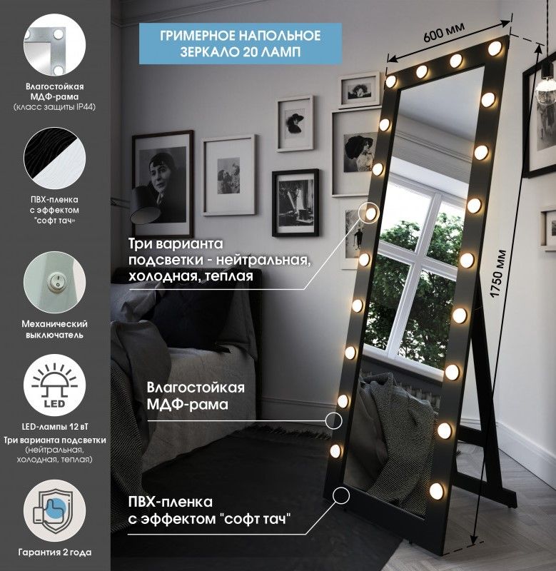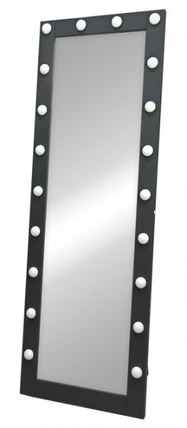 Зеркало Гримерное напольное черное 600х1750 (20 ламп)LED подсветка 6000К механический выключатель рама МДФ цвет рамы - черный