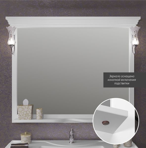 Светильники приобретаюся отдельно.Зеркала по умолчанию идут с отверстиями под светильники. В случае отсутствия необходимости заказа светильников, возможна комплектация зеркала декоративными накладками серебро или бронза.Коллекция Риспекто символизирует лучшие традиции неоклассики в сочетании с необыкновенной функциональностью и простотой дизайна.Строгий контроль при изготовлении изделий исключает наличие малейших дефектов. Зеркальное полотно дает четкое отражение без каких-либо искажений. Слоновая кость цвет прекрасно дополнит интерьер ванной комнаты.