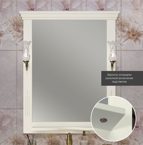 Светильники приобретаюся отдельно.Зеркала по умолчанию идут с отверстиями под светильники. В случае отсутствия необходимости заказа светильников, возможна комплектация зеркала декоративными накладками серебро или бронза.Коллекция Риспекто символизирует лучшие традиции неоклассики в сочетании с необыкновенной функциональностью и простотой дизайна.Строгий контроль при изготовлении изделий исключает наличие малейших дефектов. Зеркальное полотно дает четкое отражение без каких-либо искажений. Слоновая кость цвет прекрасно дополнит интерьер ванной комнаты.