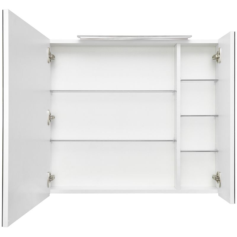 Зеркальный шкаф OLETA оснащен светильником от европейского бренда Ebir с возможностью регулировки положения, IP 44, 5 700 K. Теплота света у светильника 5 700 K – это яркий свет, идеальный для нанесения макияжа и бритья. Положение светильника можно регулировать: наклонить слегка вниз или направить свет повыше. За зеркальными фасадами расположены регулируемые по высоте полочки из просветленного стекла. Фасады оснащены петлями Hettich с плавным закрыванием.