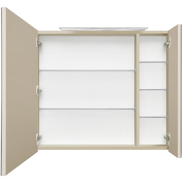 Зеркальный шкаф OLETA оснащен светильником от европейского бренда Ebir с возможностью регулировки положения, IP 44, 5 700 K. Теплота света у светильника 5 700 K – это яркий свет, идеальный для нанесения макияжа и бритья. Положение светильника можно регулировать: наклонить слегка вниз или направить свет повыше. За зеркальными фасадами расположены регулируемые по высоте полочки из просветленного стекла. Фасады оснащены петлями Hettich с плавным закрыванием.