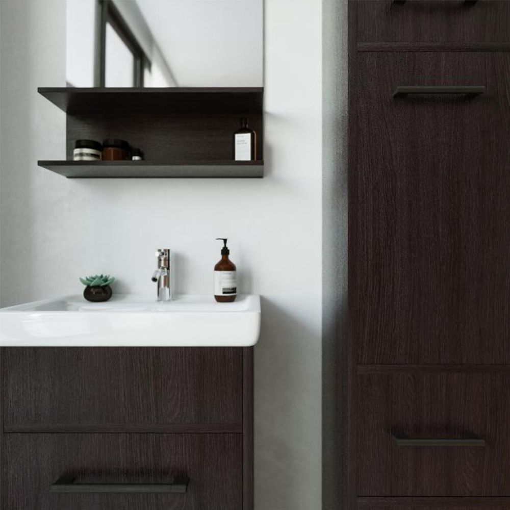 Его чистые линии и сдержанная форма создают гармоничный контраст с отделкой стен и сантехникой, добавляя комнате ощущение простоты и элегантности.