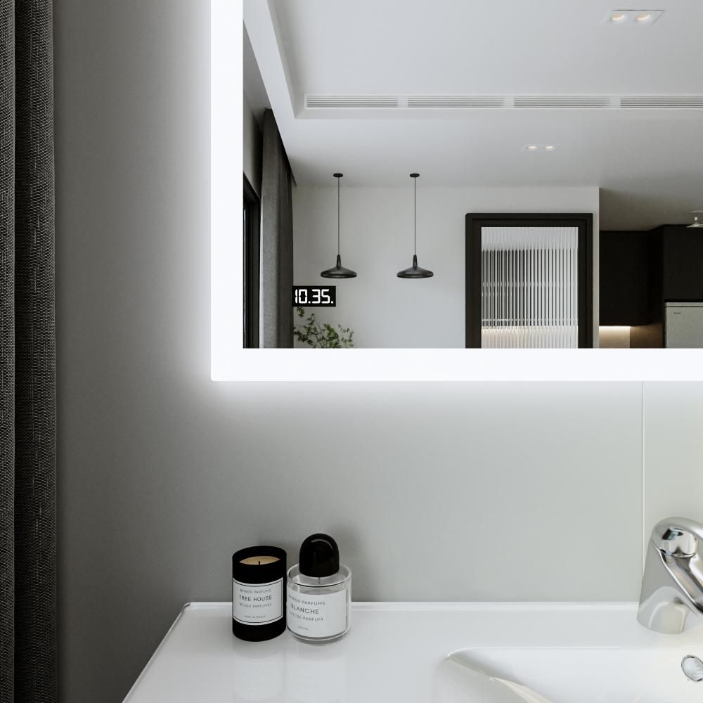 Его чистые линии и сдержанная форма создают гармоничный контраст с отделкой стен и сантехникой, добавляя комнате ощущение простоты и элегантности.