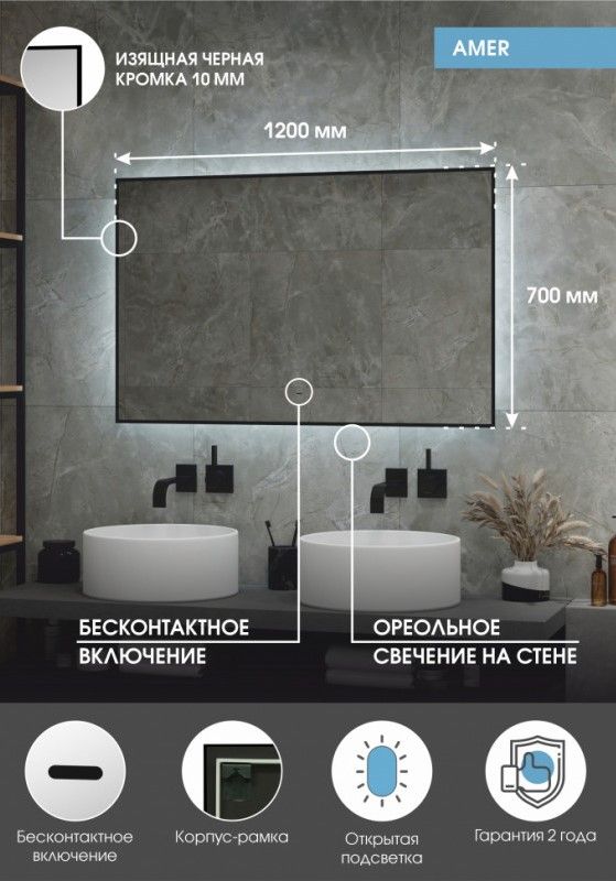 Зеркало "Amer Led" с фоновой подсветкой, бесконтактным сенсором, черной окантовкой 1200х700LED подсветка 6000К;бесконтактный сенсор с функцией димирования;открытая ореольная подсветка.