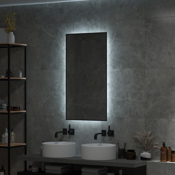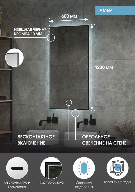 Зеркало "Amer Led" с фоновой подсветкой, бесконтактным сенсором, черной окантовкой 600х1200LED подсветка 6000К;бесконтактный сенсор с функцией димирования;открытая ореольная подсветка.