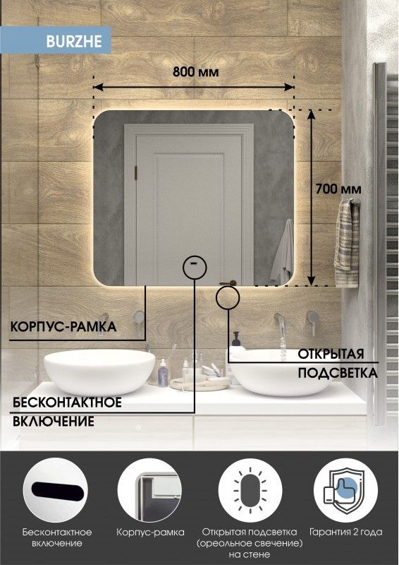 Зеркало "Burzhe Led" 800х700 с бесконтактным сенсором, холодная подсветкаLED подсветка 6000Кбесконтактный сенсор с функцией димированияореольная подсветка