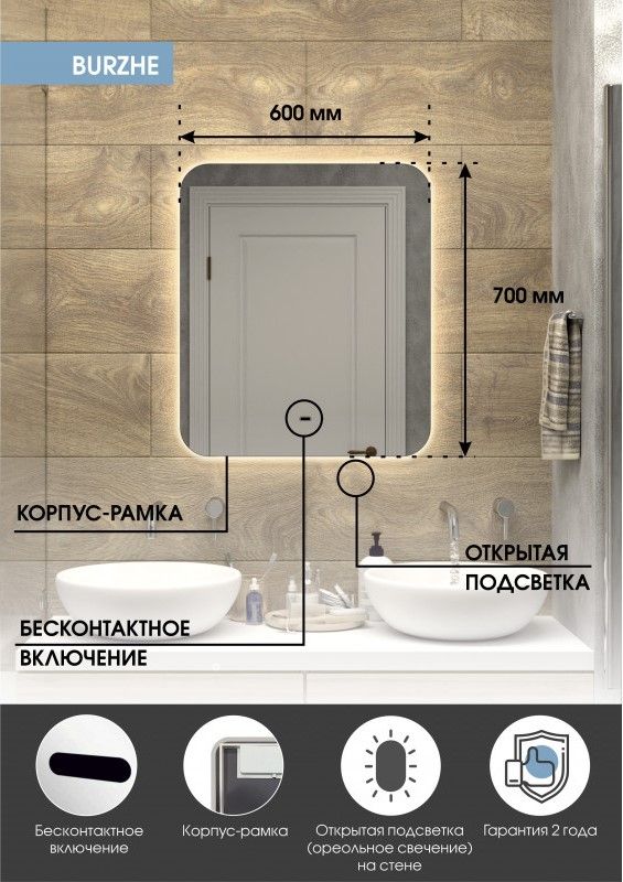 Зеркало "Burzhe Led" 600х700 с бесконтактным сенсором, холодная подсветкаLED подсветка 6000Кбесконтактный сенсор с функцией димированияореольная подсветка