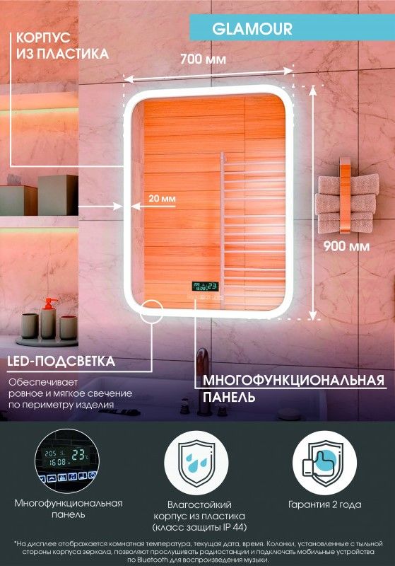 Зеркало "Glamour Led" 700х900 с музыкальным блоком, подогревомLED подсветка 6000Ксенсорное управление функциямивстроенные часы с индикацией датыдатчик температуры воздухафункция антизапотеваниямузыкальная система