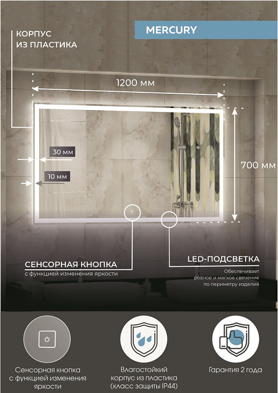 Зеркало "Mercury Led" 1200х700LED подсветка 6000Ксенсорный выключатель с функцией димирования