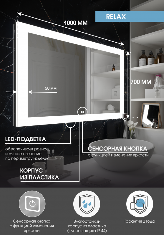 Зеркало "Relax Led" 1000х700LED подсветка 6000Ксенсорный выключатель с функцией димирования