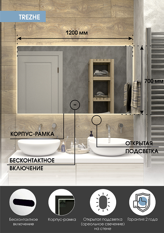 Зеркало "Trezhe Led" 1200х700 с бесконтактным сенсором, холодная подсветкаLED подсветка 6000Кбесконтактный сенсор с функцией димированияореольная подсветка