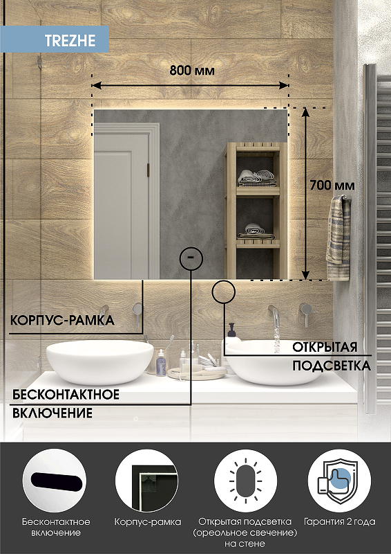Зеркало "Trezhe Led" 800х700 с бесконтактным сенсором, холодная подсветкаLED подсветка 6000Кбесконтактный сенсор с функцией димированияореольная подсветка