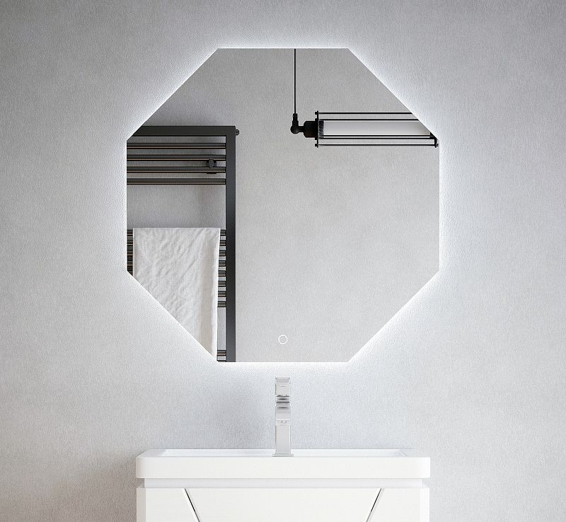 Зеркало "Каре" шириной 700 и высотой 700 мм. Правильный 8-гранник. Осуществляется подсветка зеркала по всему периметру СЗАДИ. LED-подсветка, сенсорный выключатель с регулировкой яркости, то есть существует возможность регулировки освещенности (делать подсветку ярче или темнее). Класс защиты: IP67. Класс энергетической эффективности: A++. Серебряное зеркало, стекло высшего качества M1. AC/DC трансформатор