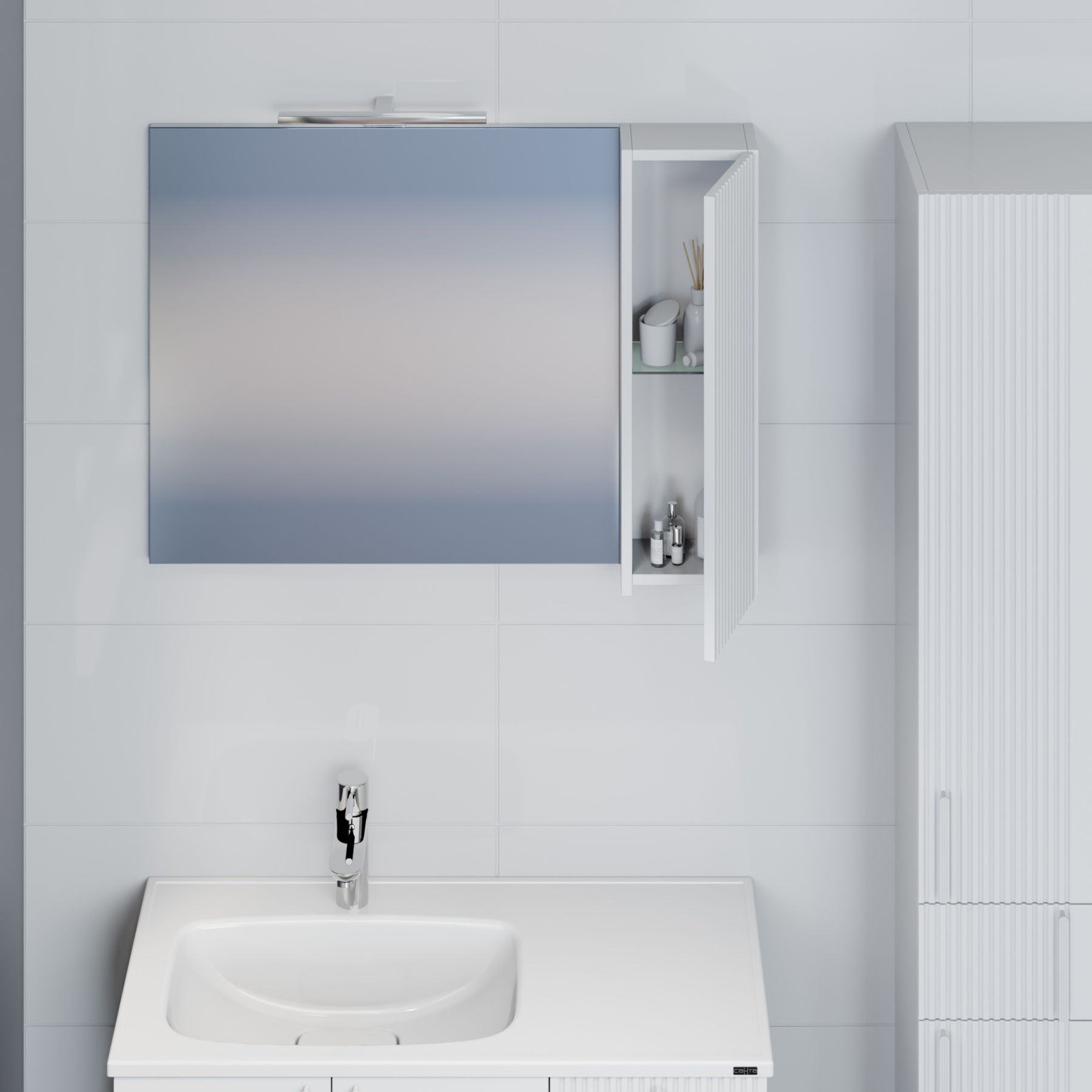Коллекция мебели для ванной комнты Санта Вега — это современное решение для вашей ванной комнаты. Фасады и боковины выполнены из МДФ и покрыты глянцевой эмалью. Дверцы оснащены петлями плавного закрывания. Фасад зеркального шкафа выполнен с вертикальной реечной фрезеровкой.